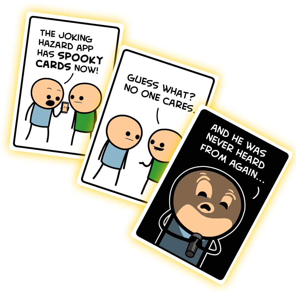 The Joking Hazard Mobile Game now has SPOOKY CARDS! Laugh your butt off while shitting your pants in fright. The Joking Hazard app is available for free in your appstore, just click below (IF YOU DARE)